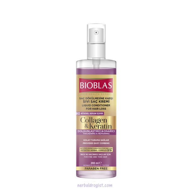 Der Bioblas Kollagen + Keratin Flüssig-Conditioner verleiht Volumen und regeneriert dünnes und voluminöses Haar. Er sorgt für einfaches Kämmen, macht das Haar glatt und verhindert, dass es elektrifiziert wird. Der Bioblas Kollagen + Keratin Flüssig-Conditioner ist wirksam gegen Haarausfall. Dermatologisch getestet.