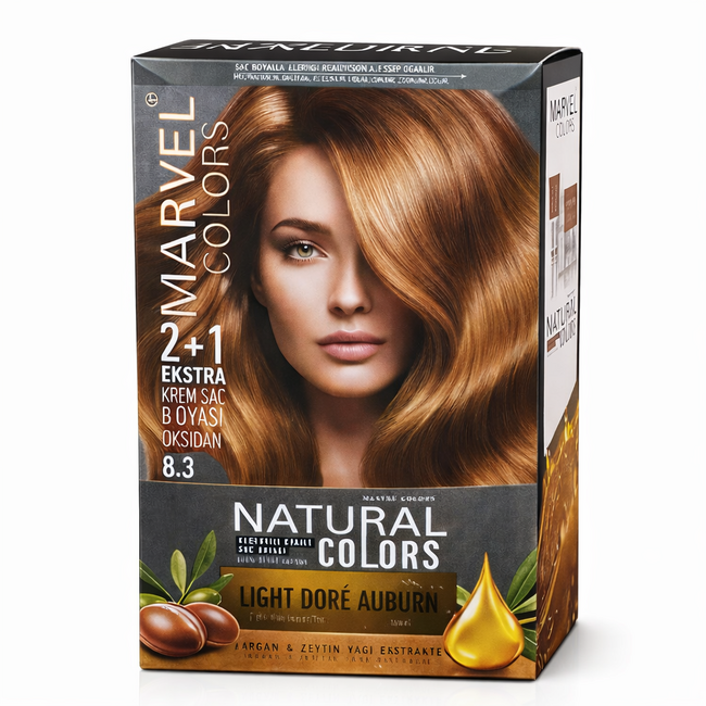 Marvel Colors 8.3 Light Doré Auburn provides a warm, luminous auburn tone with natural golden reflections. Its permanent cream formula penetrates evenly into the hair fiber, ensuring an intense and long-lasting color result.