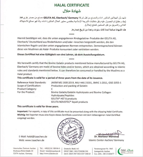 SUDA COLLAGEN® helal sertifikasına sahip %100 sığır kolajeni ile üretilir.Tüm ürünleri için Helal sertifikası vardır.