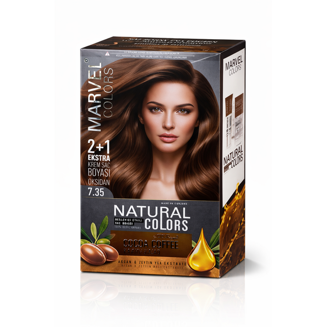 Marvel Colors Natural Colors 7.35 Cocoa Coffee, sıcak kahve tonuna sahip, hafif bakır yansımalar sunan kalıcı krem saç boyasıdır. Yoğun pigmentli formülü sayesinde saç köklerinden uçlara kadar eşit renk dağılımı sağlar ve beyaz saçları tamamen kapatır.